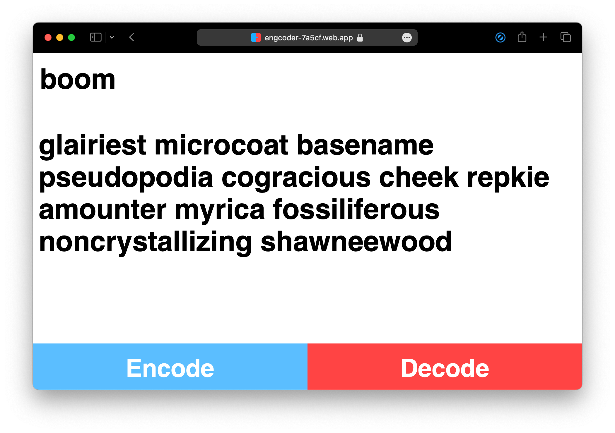 EngCode uses 128-bit AES encryption to encode any string of characters you give it as a list of many often esoteric English words.